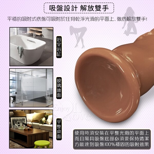 一體成型設計,握感結實,表層細緻Q韌,在底座加上了強力吸盤,可以讓老二棒吸附在任何光滑的表面,不論是玻璃、地板、牆壁等,如此一來您可以使用各種的體位 (坐姿、蹲姿、後背式) 來達到各種不同的高潮體驗。