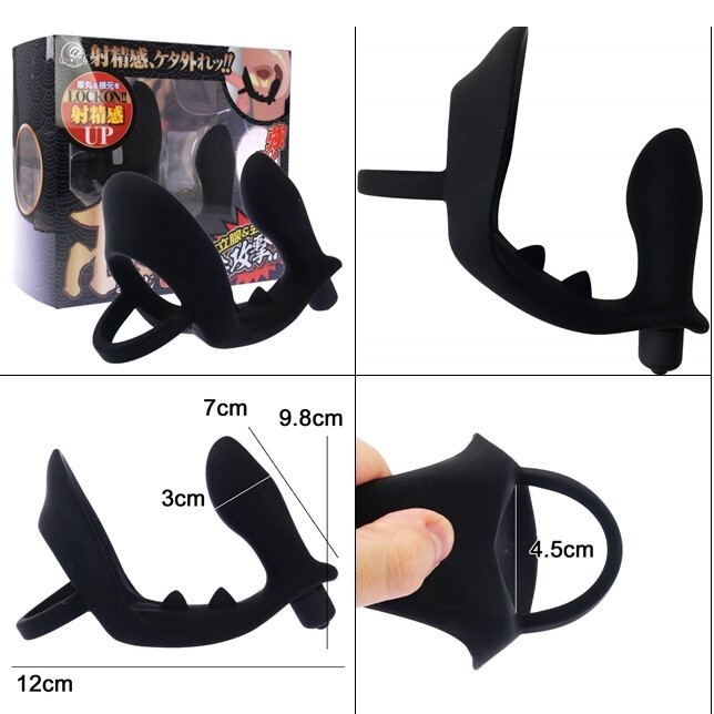 リング部分が竿と睾丸を締め付け、射精感UP!2か所の突起が会陰を、スティックローター内臓のプラグが前立腺を総攻撃!