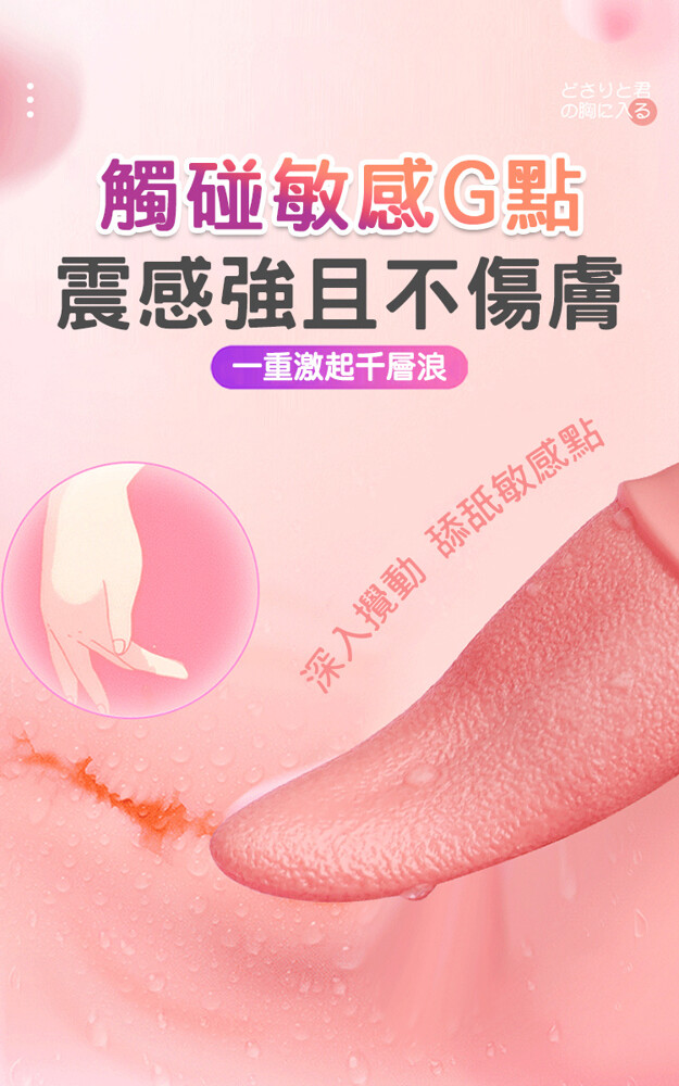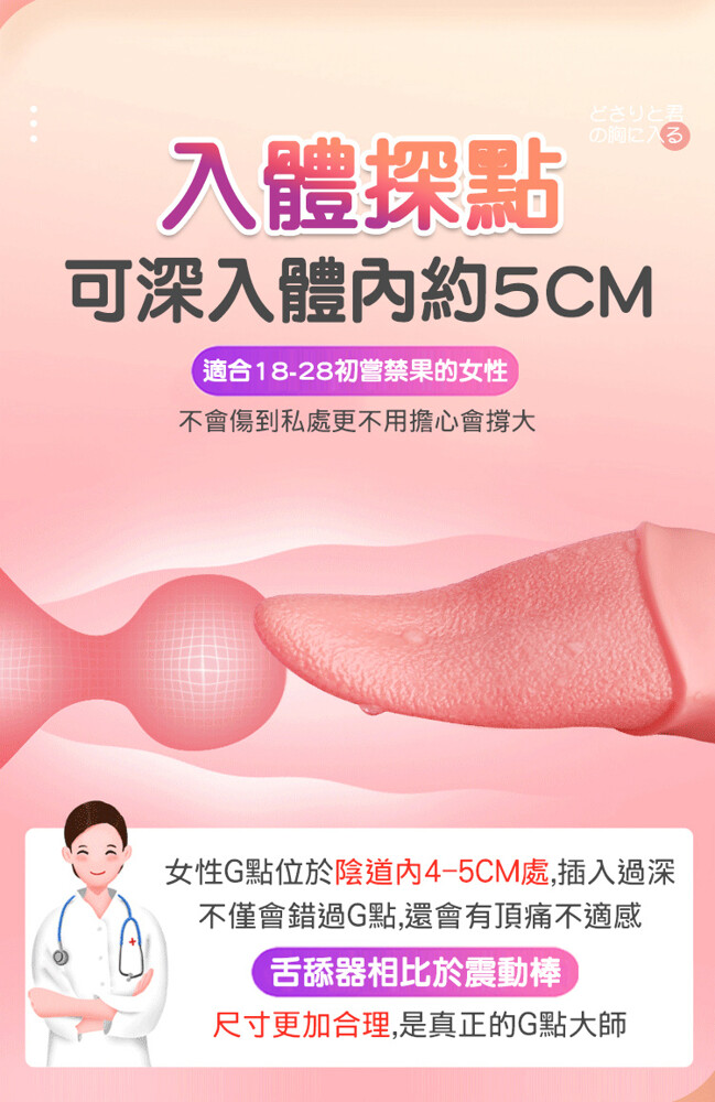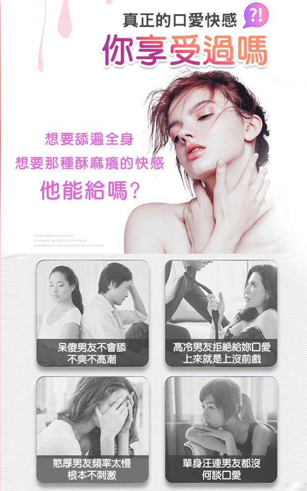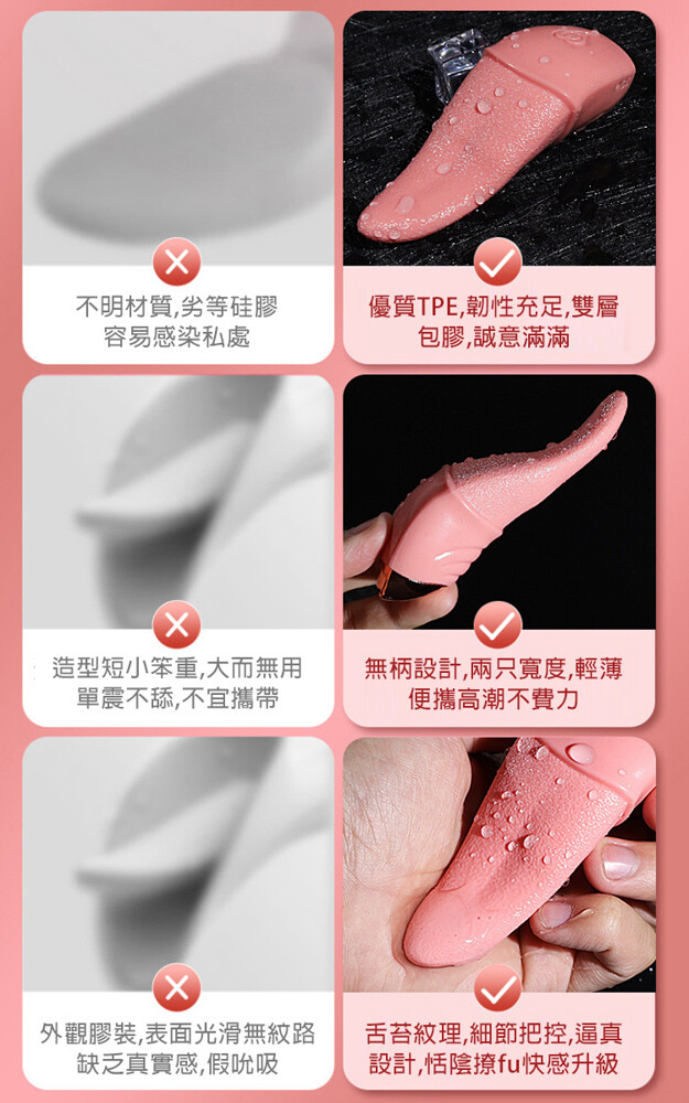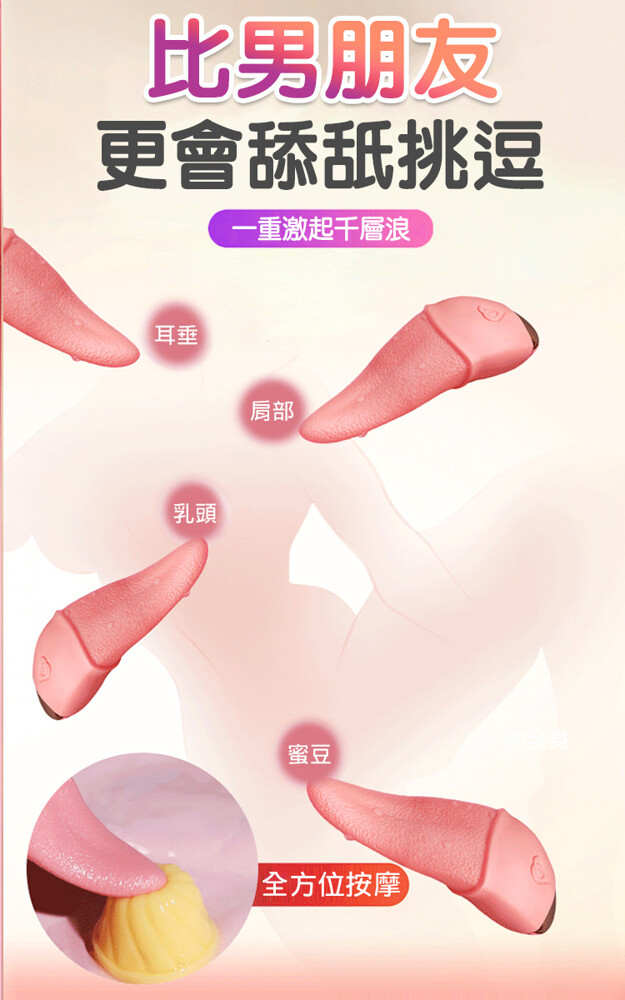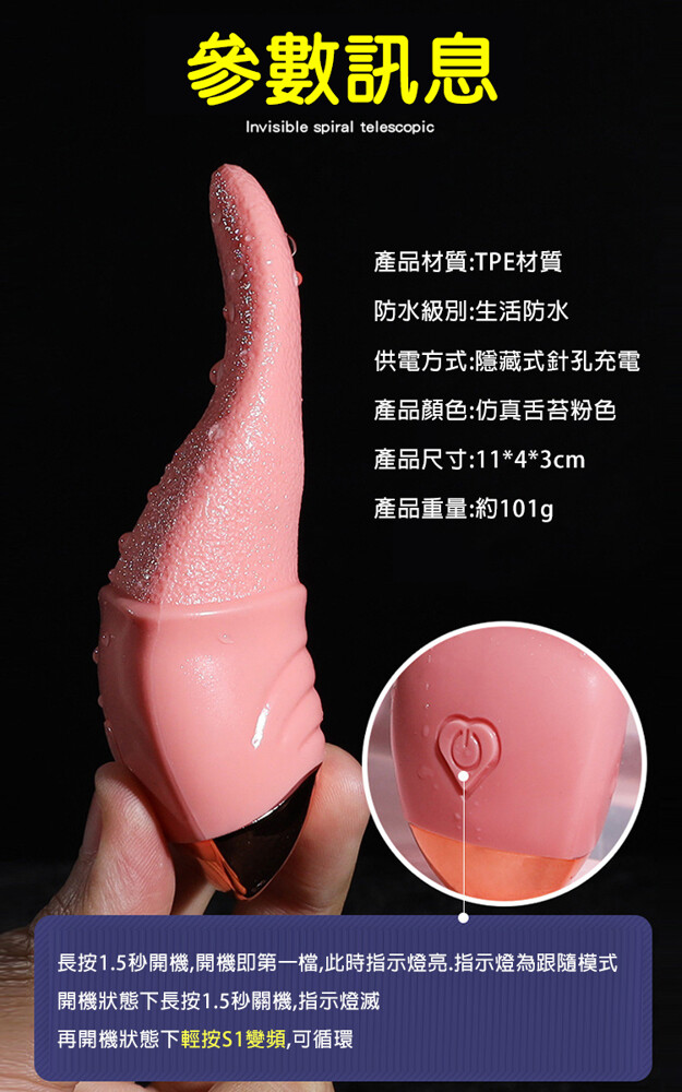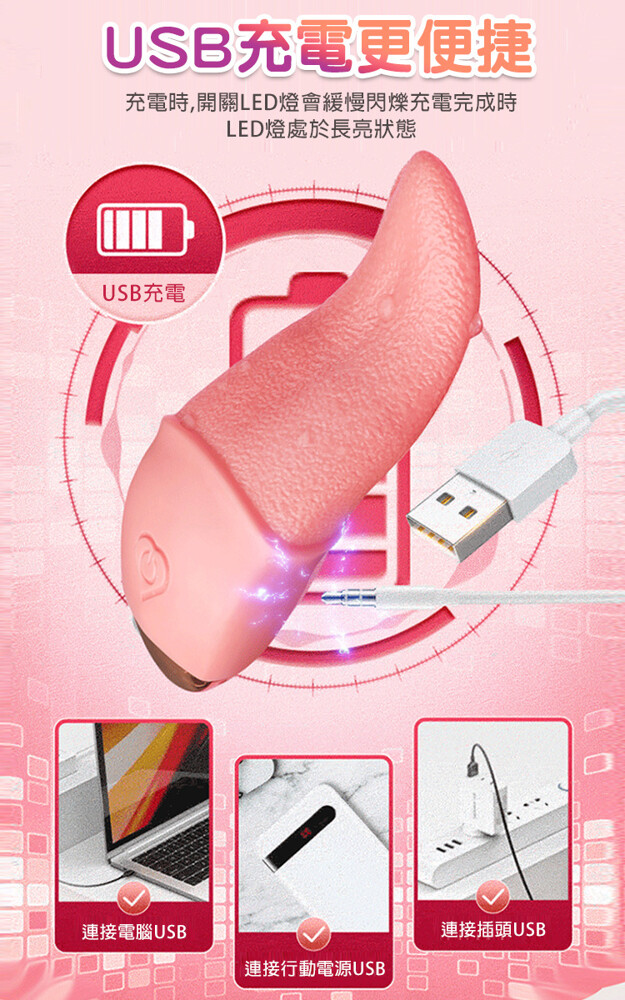 包裝內容物:外盒x1、包裝袋x1、舌舔震動棒x1、說明書x1、充電線x1