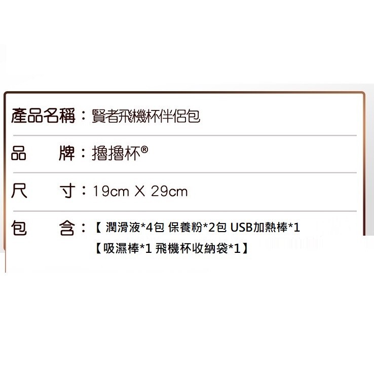 包 含:潤滑液*4包 保養粉*2包 USB加熱棒*1 吸濕棒*1 飛機杯收納袋*1