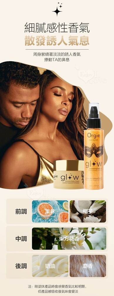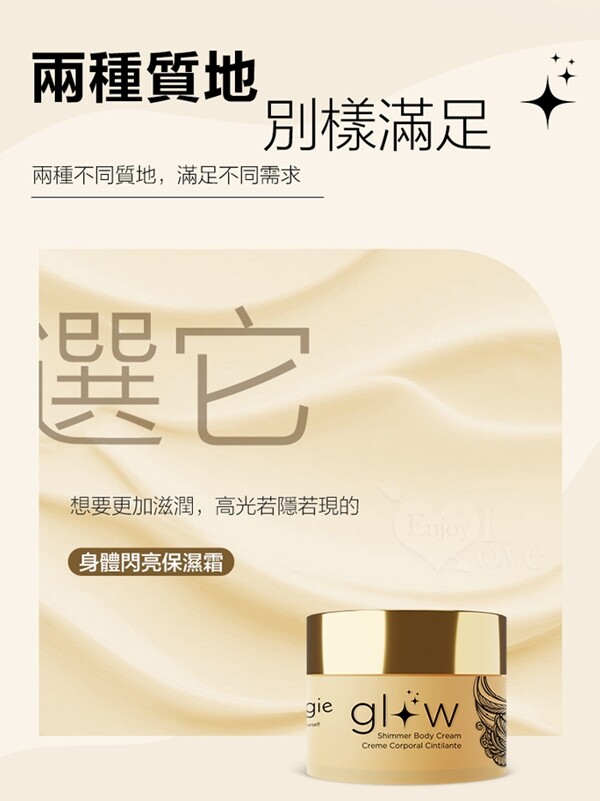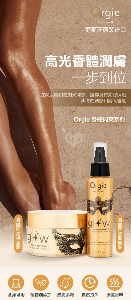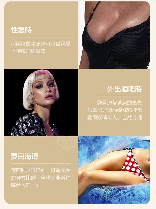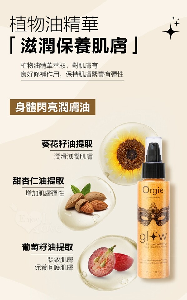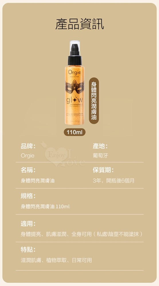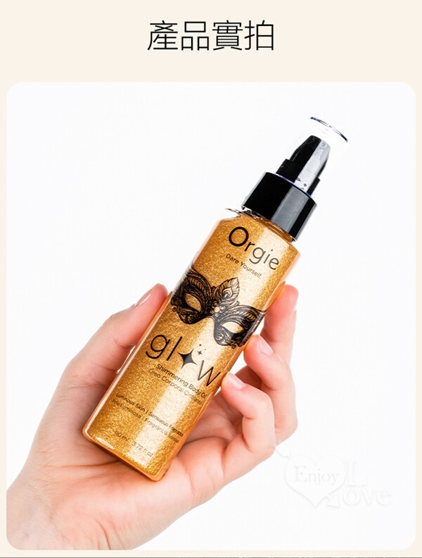 輕盈閃亮的身體潤膚油,帶有細膩、誘人的感官香氣。多種植物油成分,滋潤、保濕肌膚,讓妳的肌膚觸感柔嫩;安全閃亮質地,可以全身塗抹,噴塗在肌膚上時,全身閃耀著金色的光澤,身體線條更加性感迷人,不管是外出泡吧使用、夏日海邊還是性愛時使用,都讓妳光澤迷人。