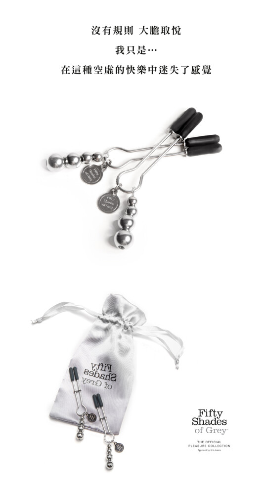 《格雷的五十道陰影 Fifty Shades of Grey》官方授權產品,打造格雷總裁與安娜的情慾世界。體驗另類激情或是誘惑調教,金屬乳夾能開啟妳的性愛能量,放大刺激感。甜蜜前戲從輕撫開始,慢慢進入更具力道的撫摸,最後使用乳夾體驗SM的奧妙之處。全新的刺激及視覺衝擊,滿足恣意妄為的侵略,喚醒內在痛快感受。讓女性朋友又羞又愛,感受深度刺激與觸電般的快感!