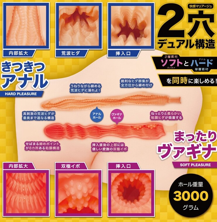 陰道器採用大型臀部外型,搭配「雙層結構陰道」和「單層結構肛門」的雙通道設計。陰道部分是柔軟舒適的雙層結構,肛門部分則是緊繃的單層結構,提供不同的刺激感受。在舒適愉悅的陰道刺激之後,可以享受到緊繃的肛門收緊!